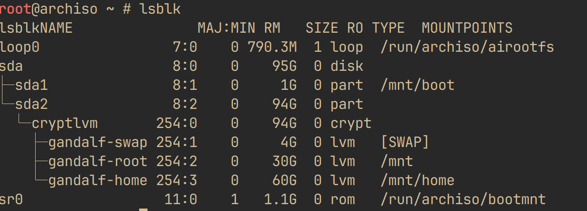 | /dev/Gandalf/swap | [SWAP] | 4GB | Swap Partition |